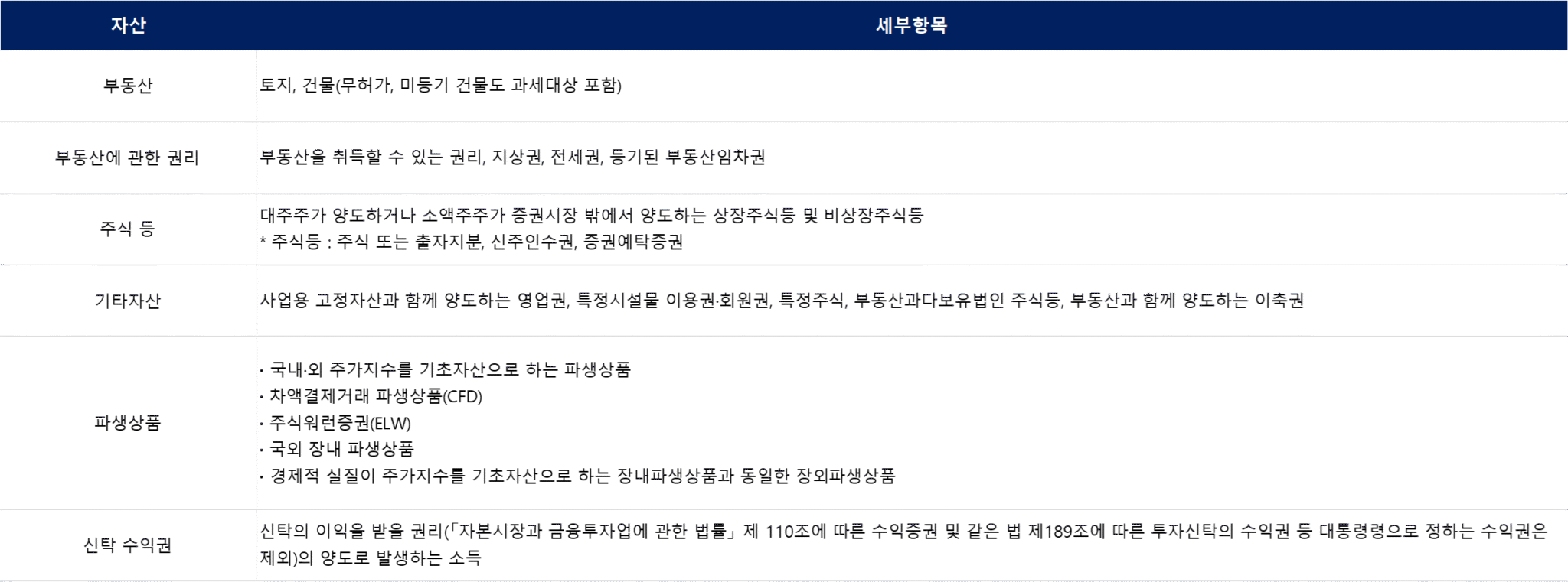 양도소득세가 과세되는 자산의 범위는 아래와 같습니다.